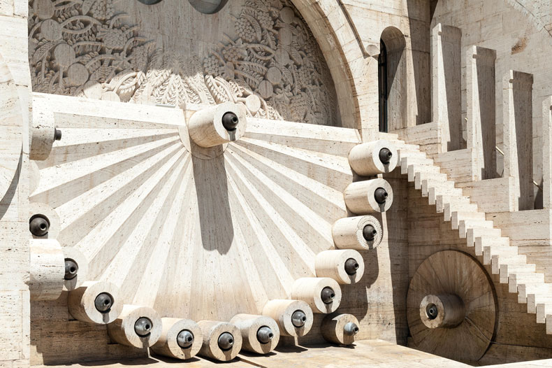 The apotheosis of this new aesthetic is the Cascade, a 300-metre-high complex of staircases, gardens and fountains that ascends a slope just to the north of Tamanyan’s great circle. Located opposite the Opera, the cascade had been envisaged by Tamanyan as a place for recreation, a kind of upper deck where the city could promenade and enjoy the finest views of Ararat. Jim Torosyan’s 1980 design followed Tamanyan but bequeathed something grander: a hanging gardens in travertine. Ascending the stairs, visitors are presented with a series of terraced gardens and gushing fountains, each representing a different stage in Armenia’s history from the Bronze Age to the 20th century, motifs picked out in high relief. Beset by construction difficulties, the complex was finished only in 2002 when Armenian-American philanthropist Gerard Cafesjian stepped in. The Cafesjian Museum of Art in the interior of the complex displays his collection and provides a much-needed escalator service for those unwilling to climb the 572 steps.