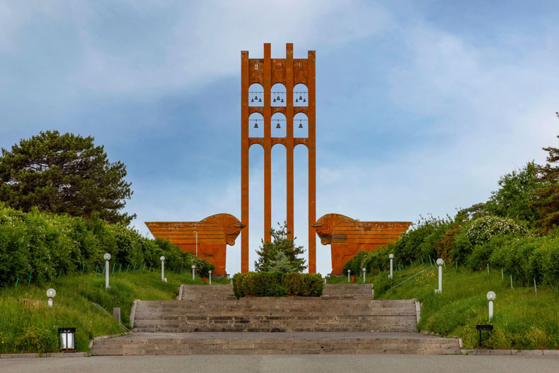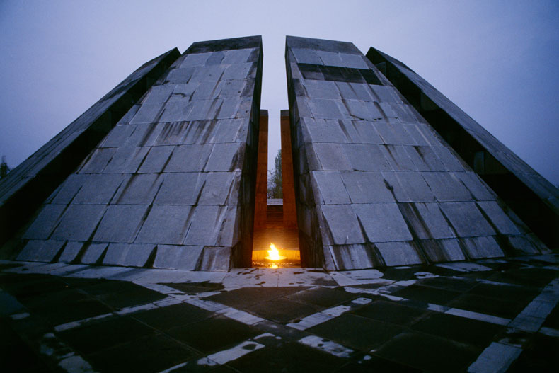 Tsitsernakaberd is located on a hill just outside Tamanyan’s ring, with central Yerevan on one side, and inaccessible Ararat on another. Visiting the complex is a moving experience. A circle of 12 basalt stelae lean dramatically towards each other over an eternal flame. For once there is no adornment, no historical motifs on the dolmen-like structure, in which each of the stelae represent one of the lost provinces of western Armenia. Visitors must walk down steps between the stones to reach the flame, which burns in a semi-subterranean memorial space. On exit, a 44-metre-high granite needle points into the sky, raising the visitors head towards the heavens, from commemoration of the past to contemplation of the future.